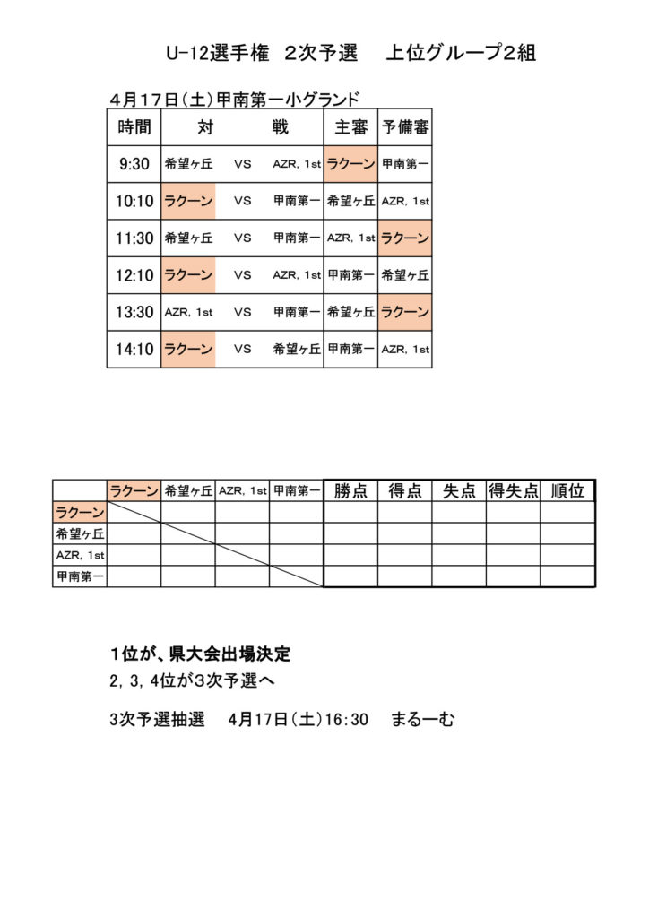 さて、U-12選手権2次予選の詳細を下記の通りお知らせいたします。