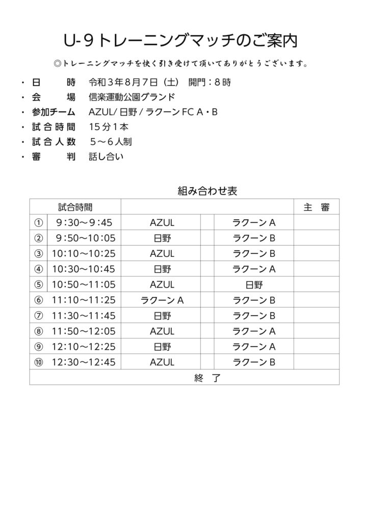 さて、U-9・U-12のトレーニングマッチの詳細を下記の通りお知らせいたします。