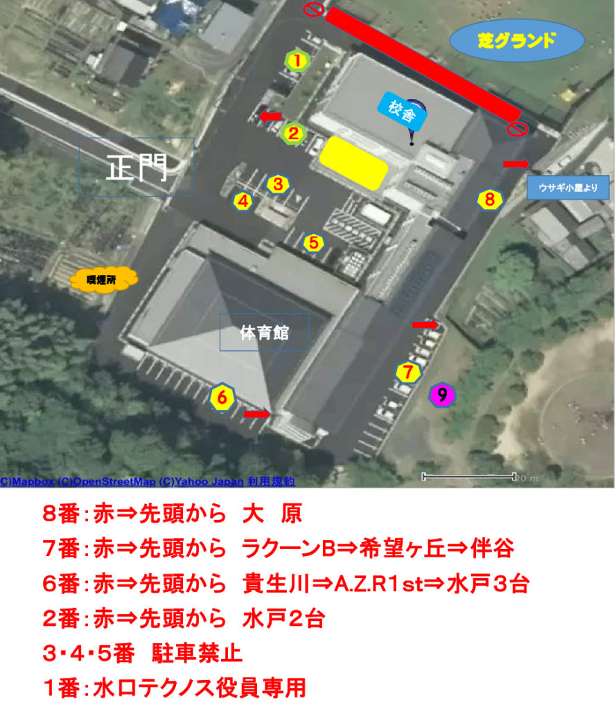 もちもの:ユニフォーム(FP:エンジ)、スパイク、ボール、すね当て、タオル、すいとう(多め)、着替え、おにぎり、防寒具