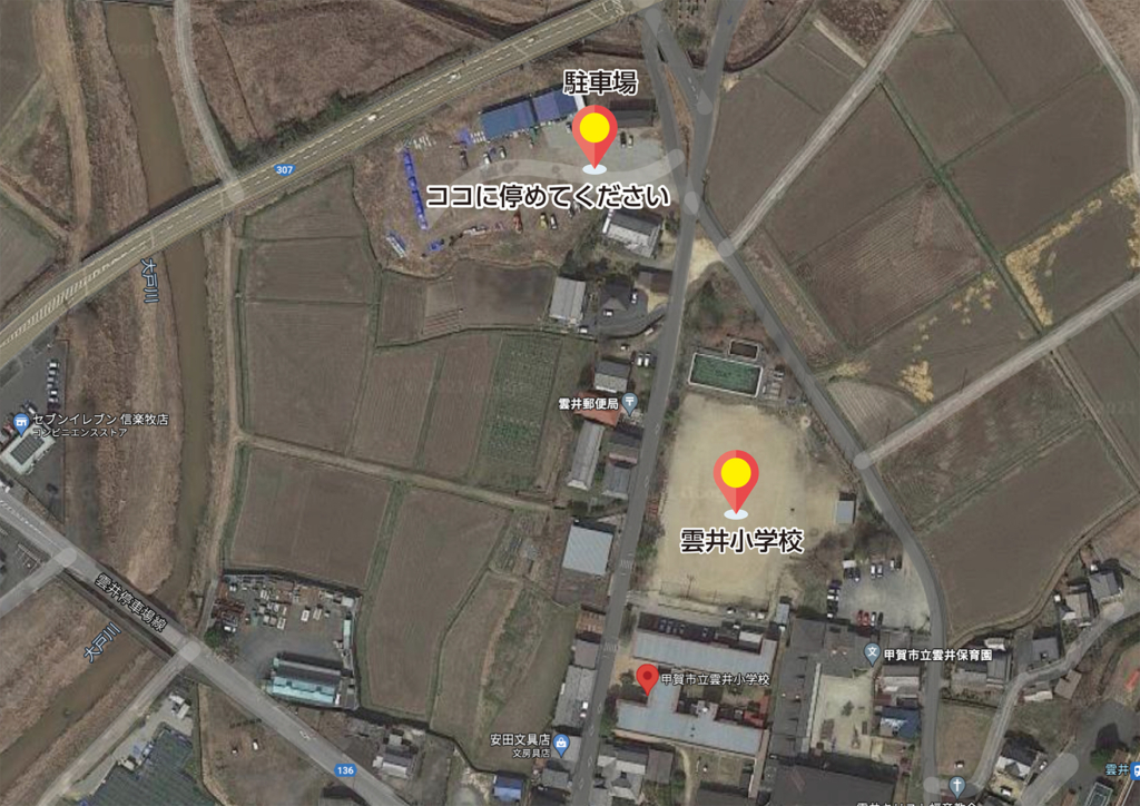 ※駐車場は雲井小学校から少し離れたところです。昨年と同じ場所ですが、わからない方は地図を張っていますので確認して気をつけてきてください。車を駐車後、徒歩で雲井小学校まできてください。