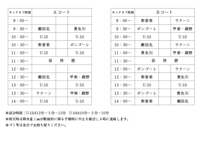 9月12日のトレーニングマッチ対戦表の変更について 2020 9/09 お知らせ 2020年9月9日 平素は当クラブ運営に対しましてご協力を厚く御礼申しあげます。 先日、9月12日(土)のトレーニングマッチの対戦表を案内させていただきましが、対戦表に変更があったため、改めて最新の対戦表を添付させていただきます。 お知らせ よかったらシェアしてね! URLをコピーしました! URLをコピーしました! 3年生から6年生 トレーニングマッチ 詳細 年少から4年生 水戸JFC招待試合 詳細 この記事を書いた人 konishi ken 関連記事 2025年8月27日のナイター練習中止 2025年8月27日 2025年6月11日のナイター練習中止 2025年6月11日 2025年5月21日のナイター練習中止 2025年5月21日 2025年3月5日のナイター練習中止について 2025年3月5日 2025年2月19日のナイター練習中止 2025年2月19日 2025年2月5日のナイター練習中止について 2025年2月5日 2024年12月11日のナイター練習雨天のため中止 2024年12月11日 2024年12月21日 キッズ生 練習場所変更のお知らせ 2024年12月10日 コメント コメントする コメントをキャンセルコメント * 名前 * メール * サイト 次回のコメントで使用するためブラウザーに自分の名前、メールアドレス、サイトを保存する。 Δ