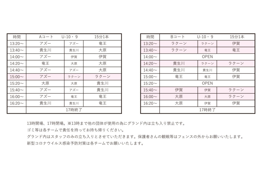 もちもの:ユニフォーム(FP・GK:エンジ)、スパイクorトレーニングシューズ、ボール、すね当て、タオル、すいとう(多め)、着替え
