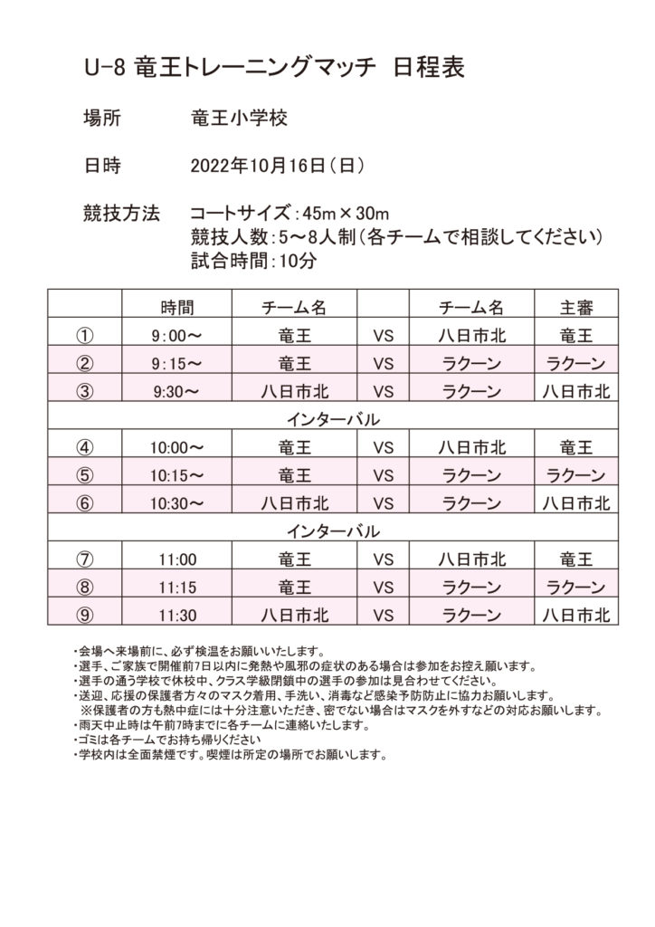 持ち物:ラクーンTシャツ、すいとう、すね当て、運動靴orトレーニングシューズ、タオル、着替え、防寒具