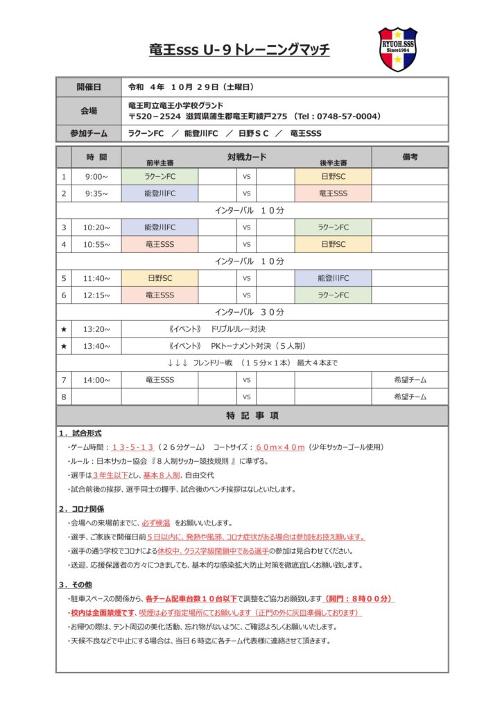 持ち物:ラクーンTシャツ、すいとう、すね当て、運動靴orトレーニングシューズ、タオル、着替え、防寒具、おにぎり