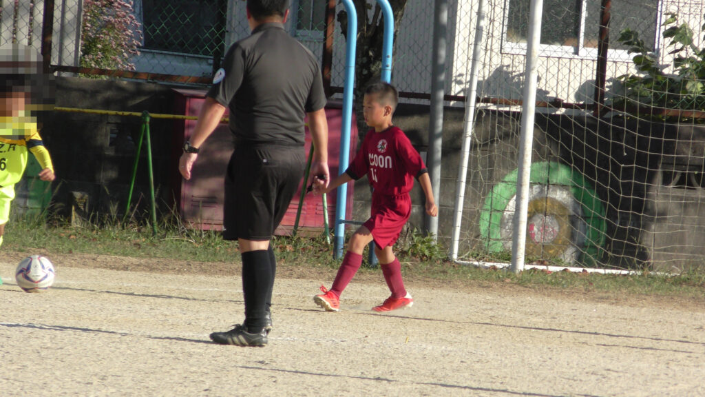 まずは、第1ピリ8人ピッチ(コート)に出ます。第1ピリが終了したらコートの反対側(保護者側)のサイドに出ます。そして第2ピリの選手8人がベンチサイドから出ます。第2ピリが終了したら第3ピリが始まります。この時は、何も考えずに交代ができるのですが、第1ピリメンバーで交代したら第2ピリには出場することはできません。ただし、第3ピリは全員出場することができます。そして第3ピリは6分たったらコートが入れ替わります。なかなかややこしいルールです。試合時間は12分と短いですが、実は3回も戦うので結局1試合は42分も子どもたちは集中を切らさず試合を行ったり、応援に回ったりしています⚽️