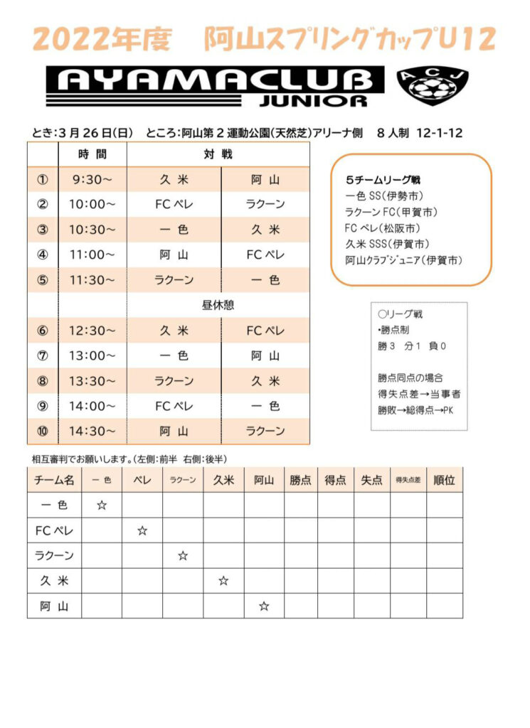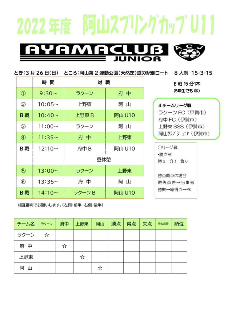 さて、U-12・U-11阿山招待の詳細を下記の通りお知らせいたします。