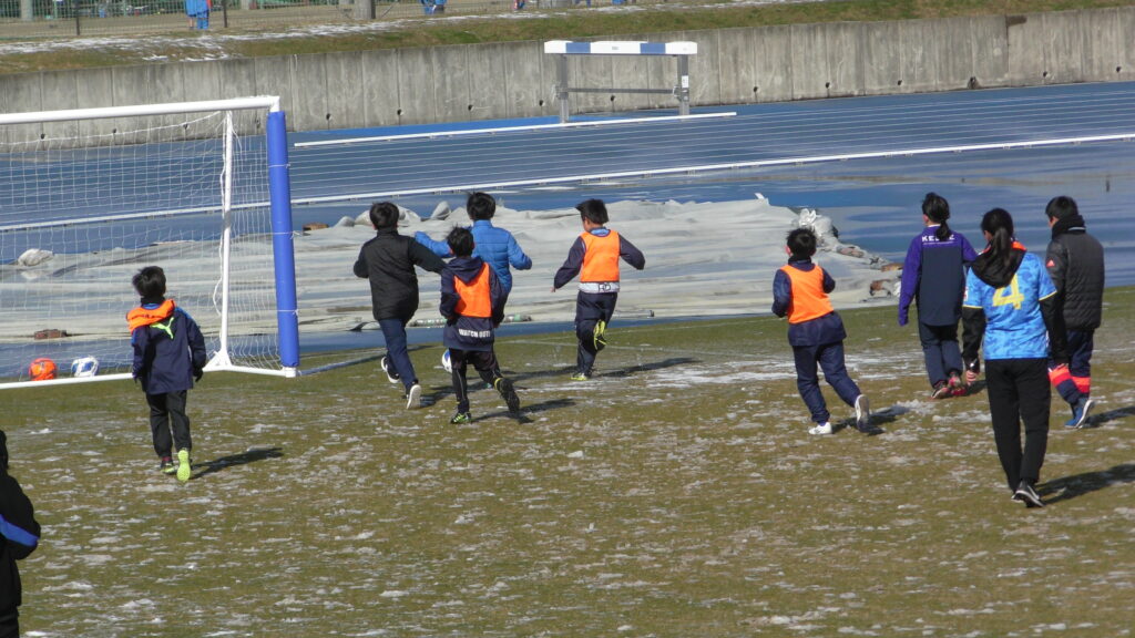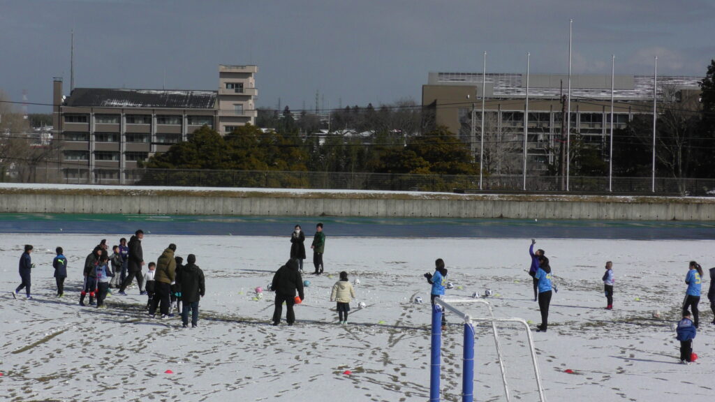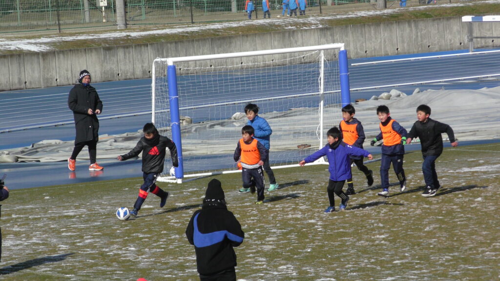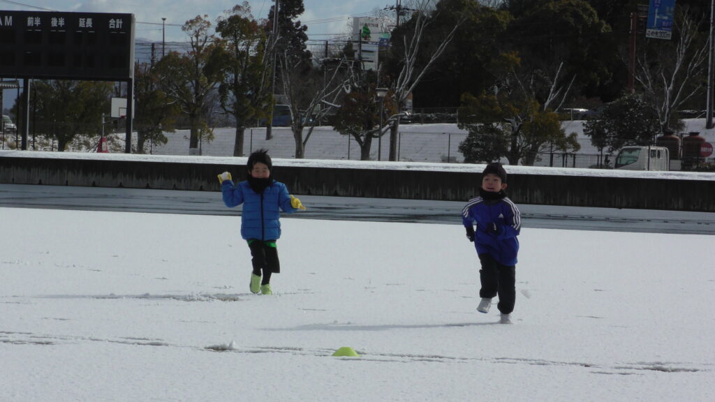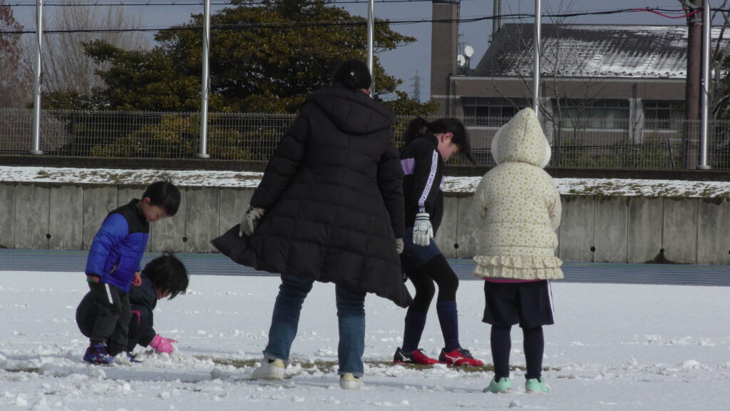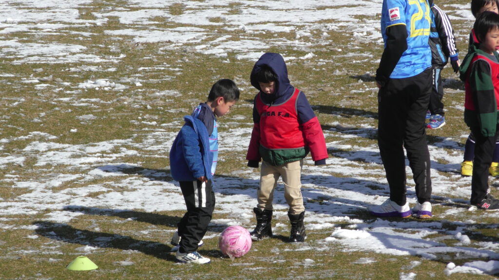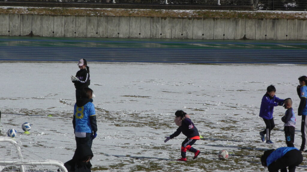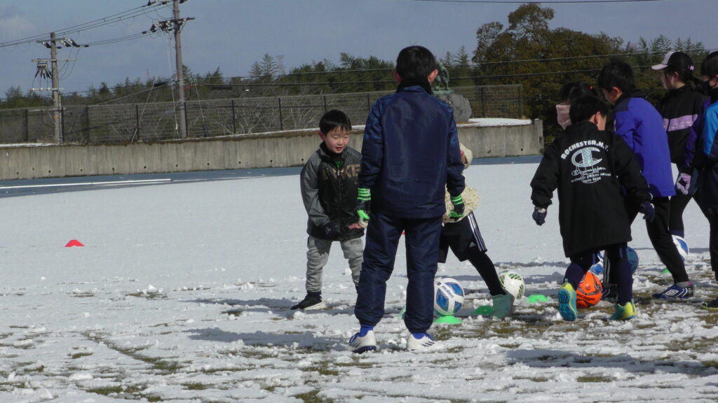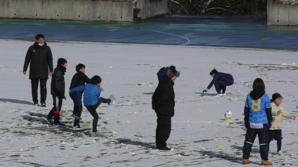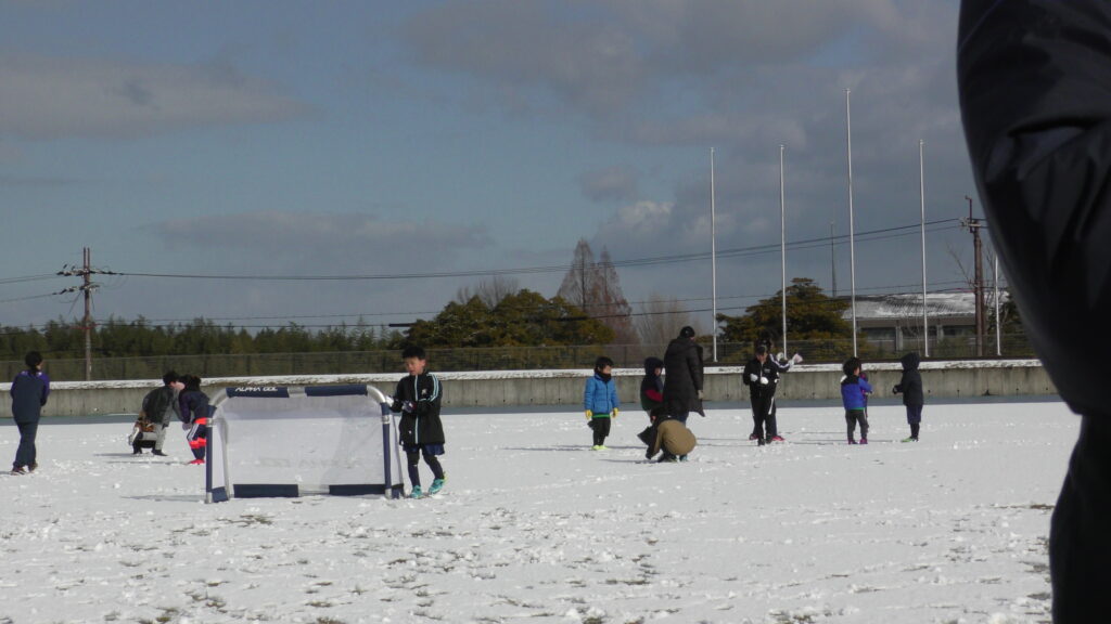 1時間ぐらいで雪も溶けてしまっていましたが、いろいろな所を使ってのリフティングを見たり、試合をして楽しみました。