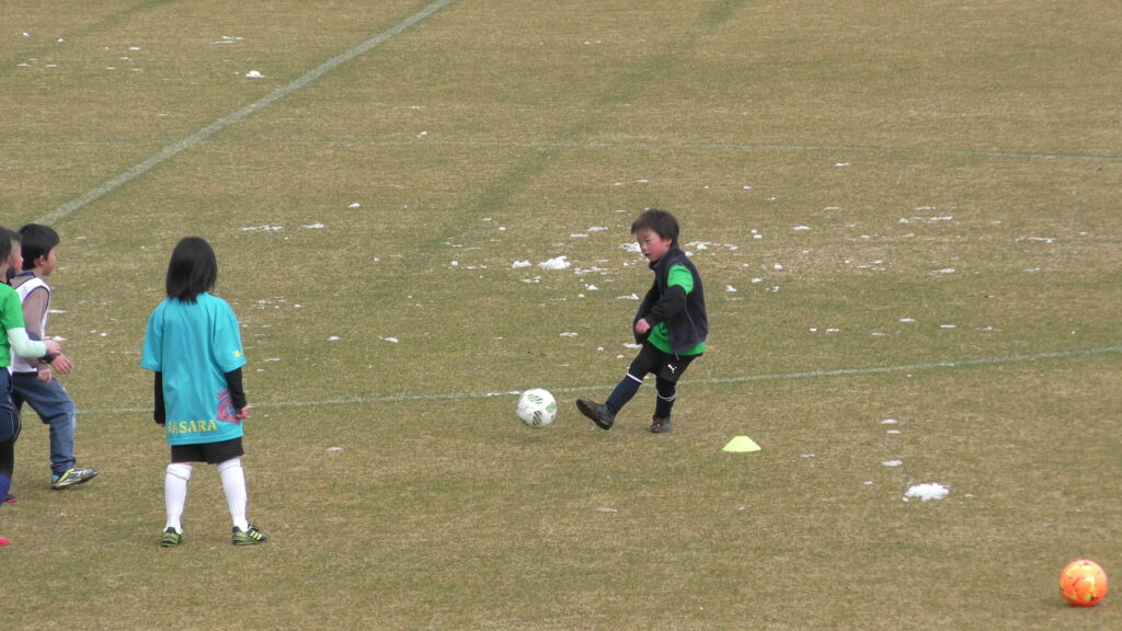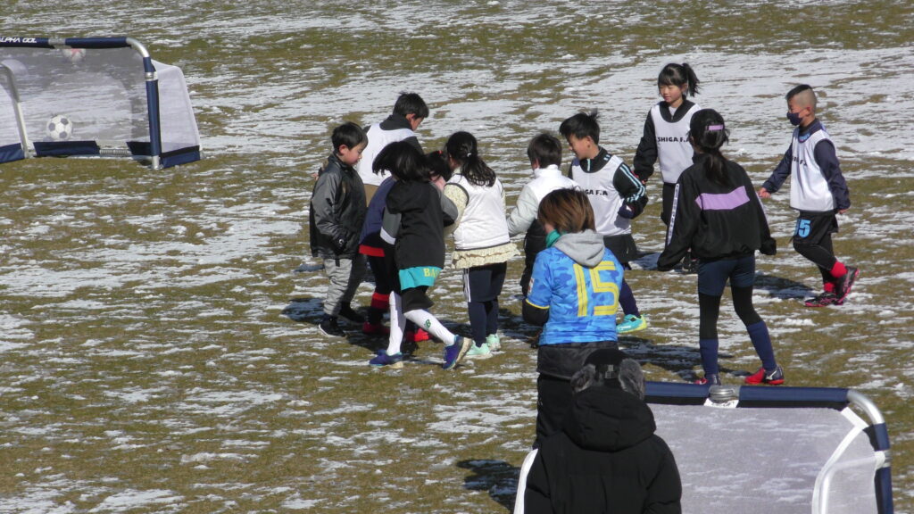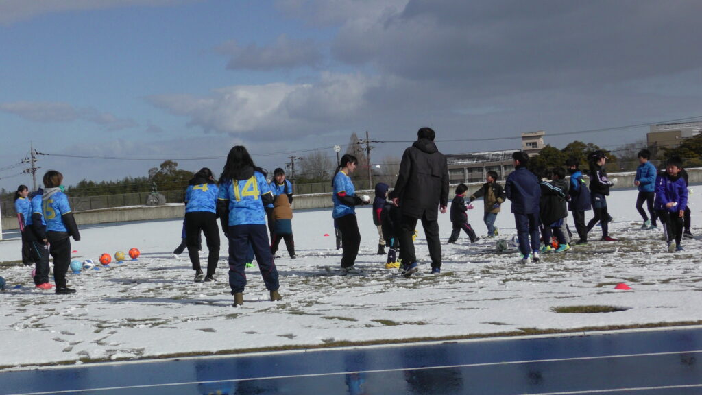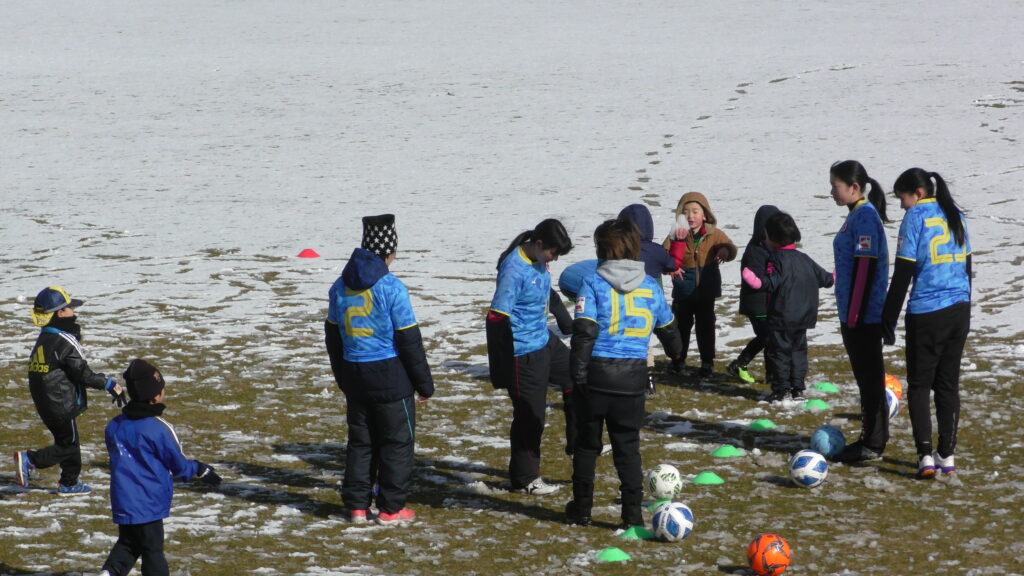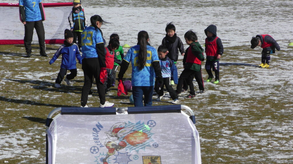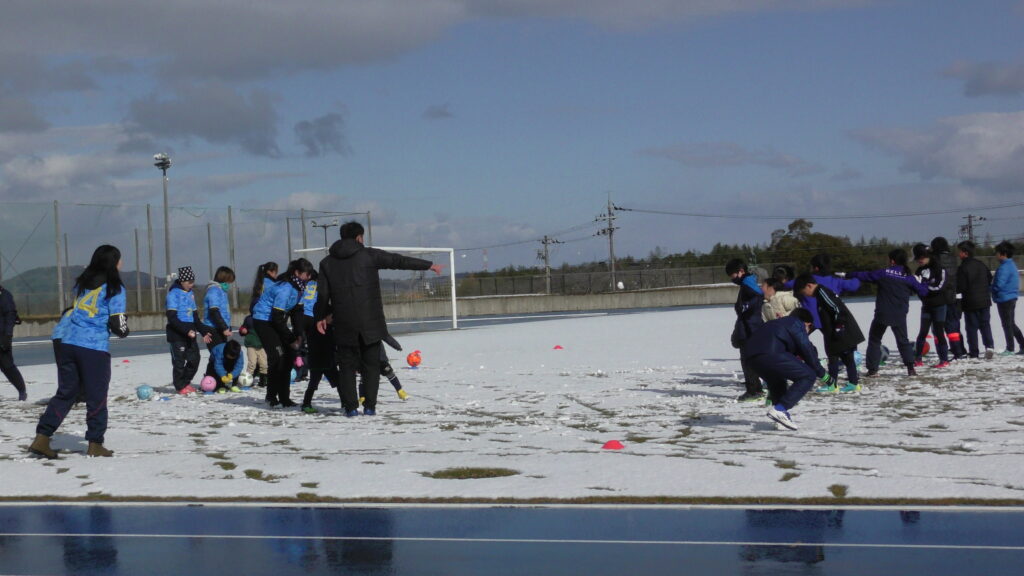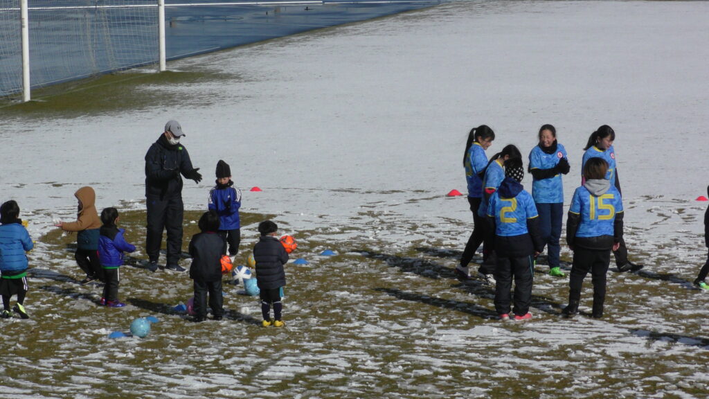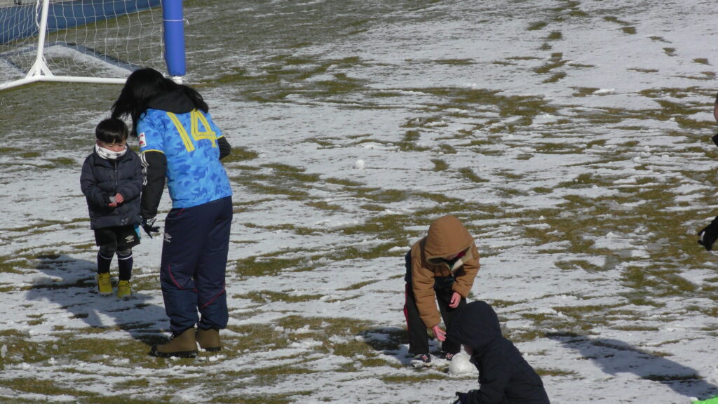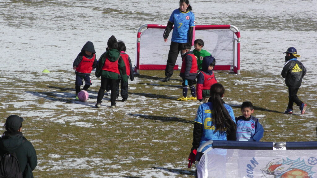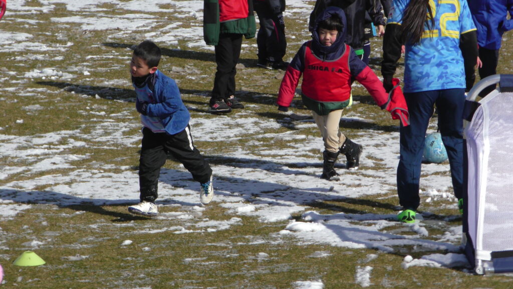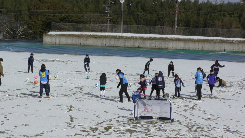 1時間ぐらいで雪も溶けてしまっていましたが、いろいろな所を使ってのリフティングを見たり、試合をして楽しみました。