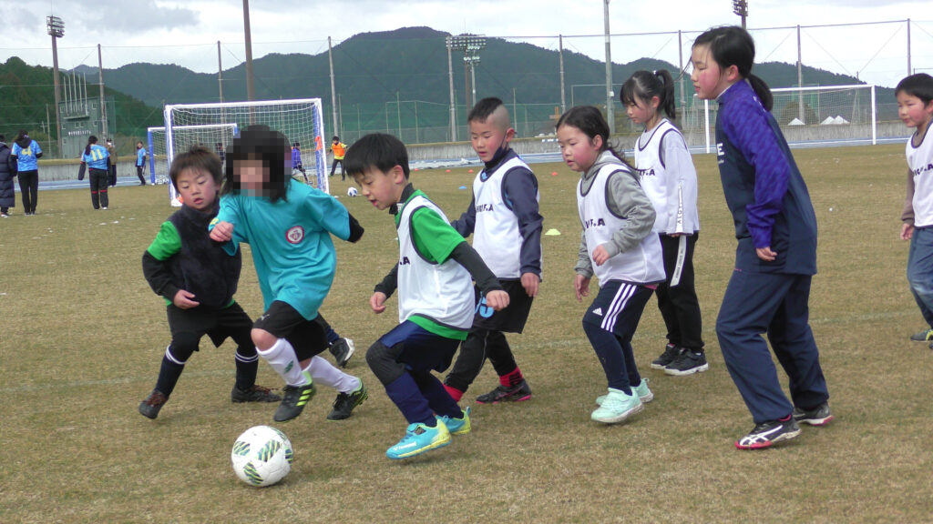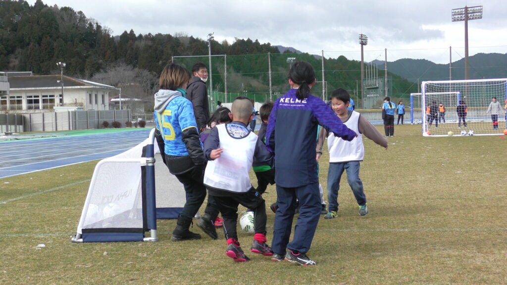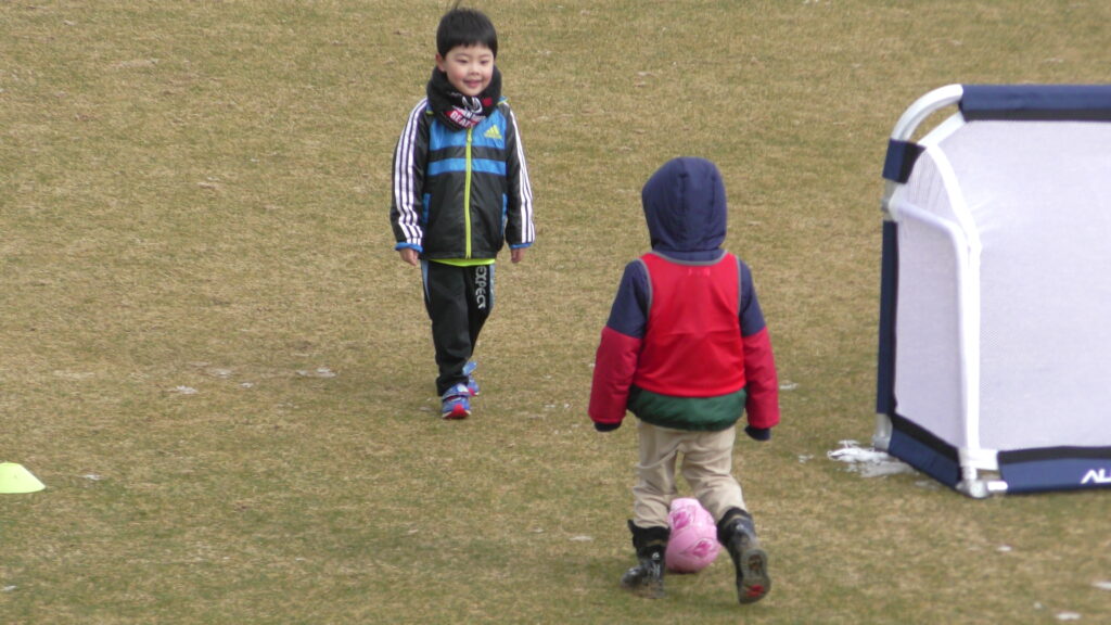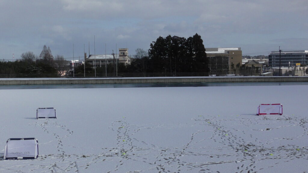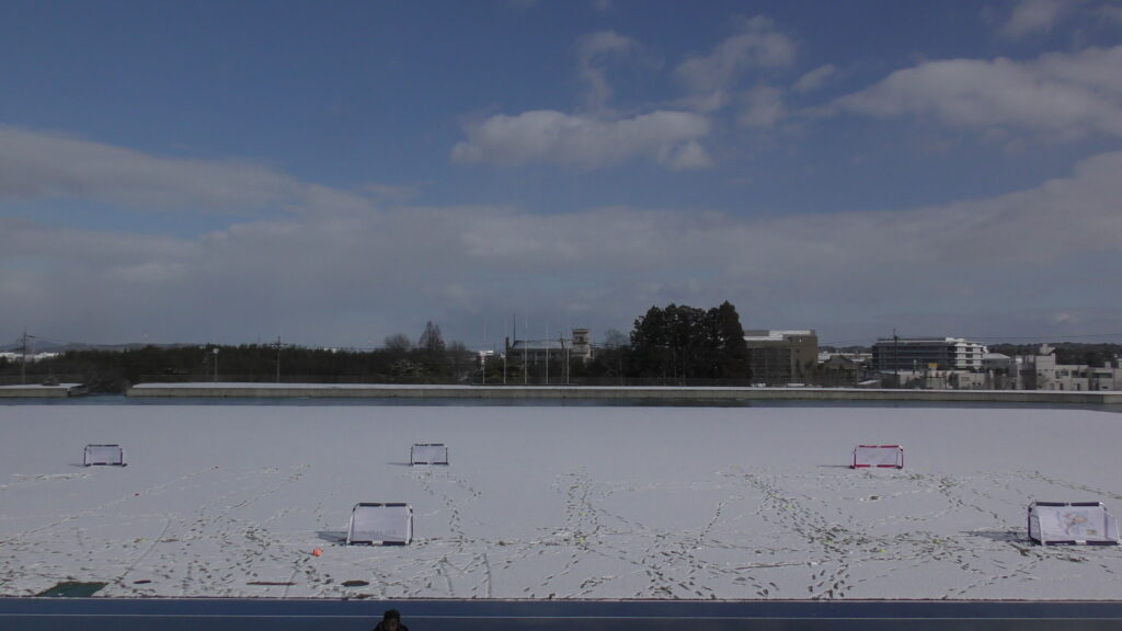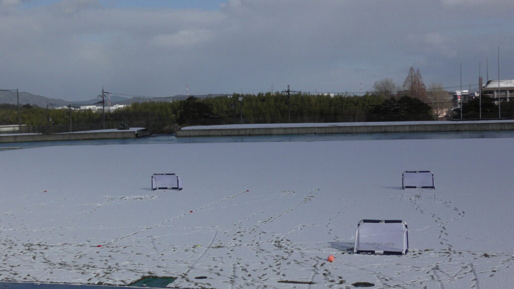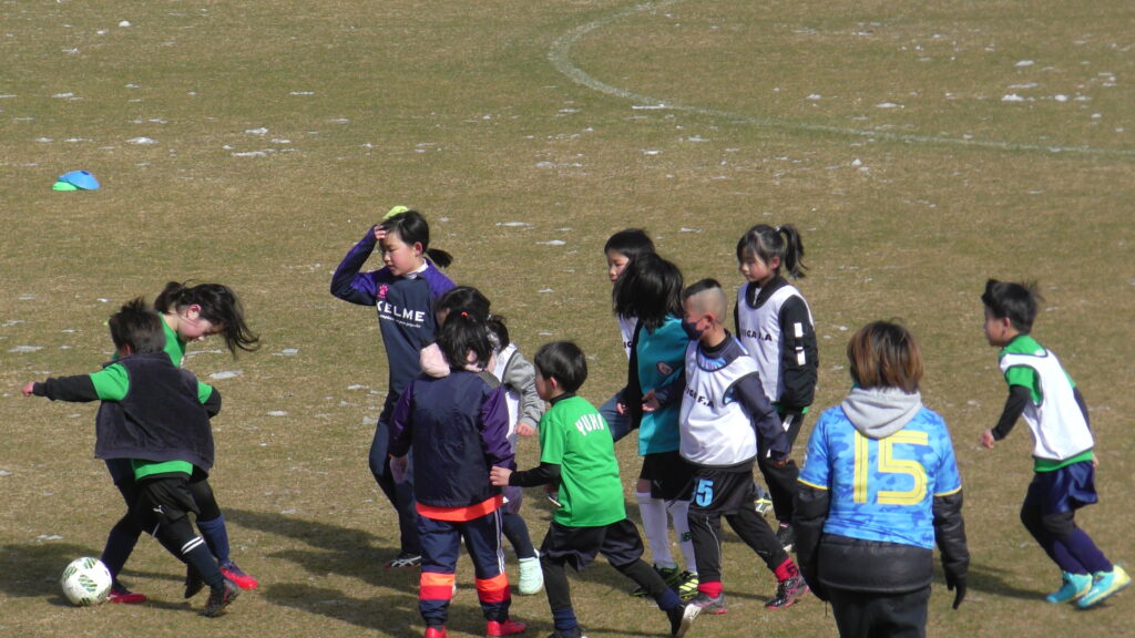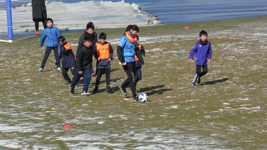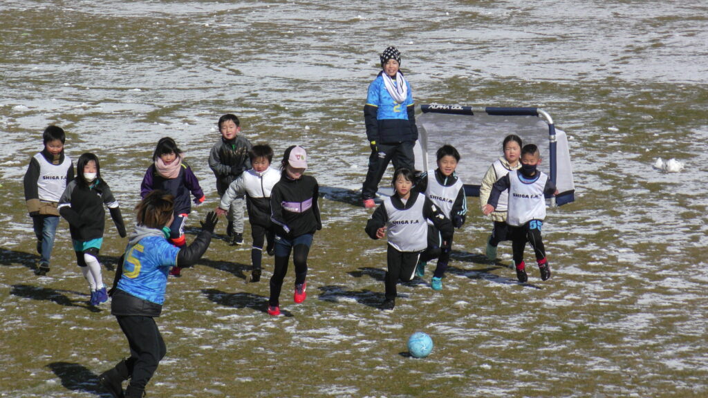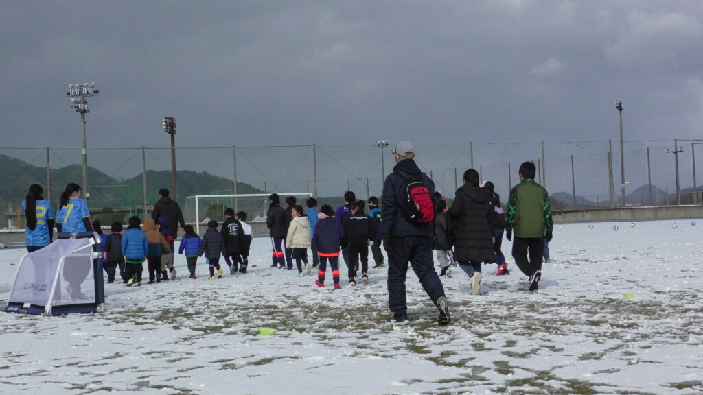 1時間ぐらいで雪も溶けてしまっていましたが、いろいろな所を使ってのリフティングを見たり、試合をして楽しみました。