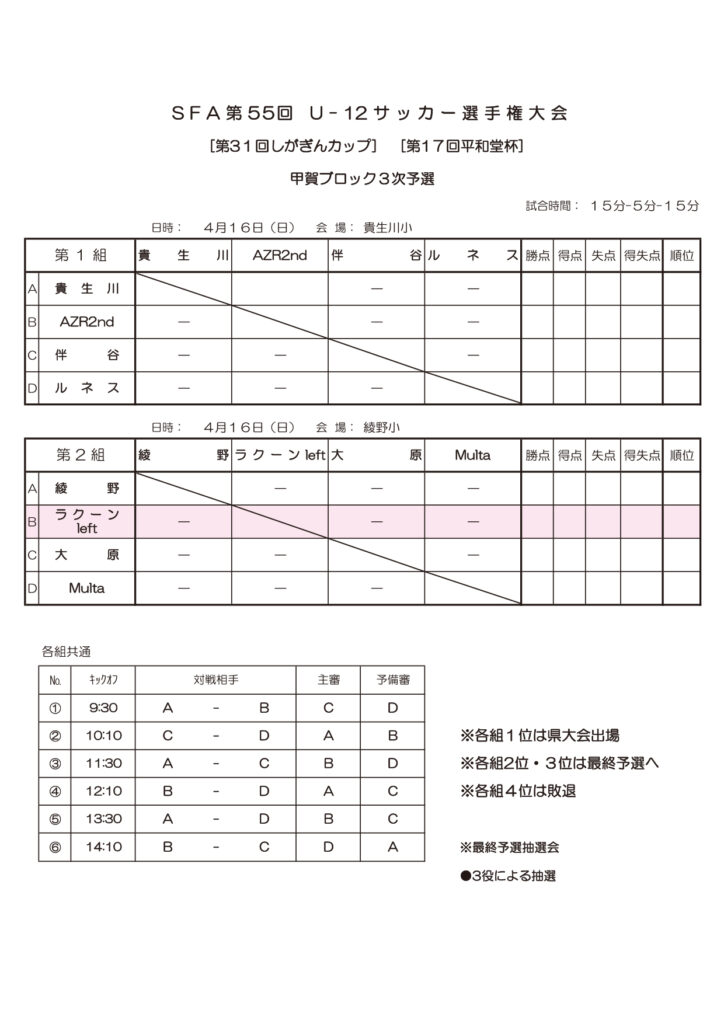 さて、U-12サッカー選手権大会三次予選の詳細を下記の通りお知らせいたします。