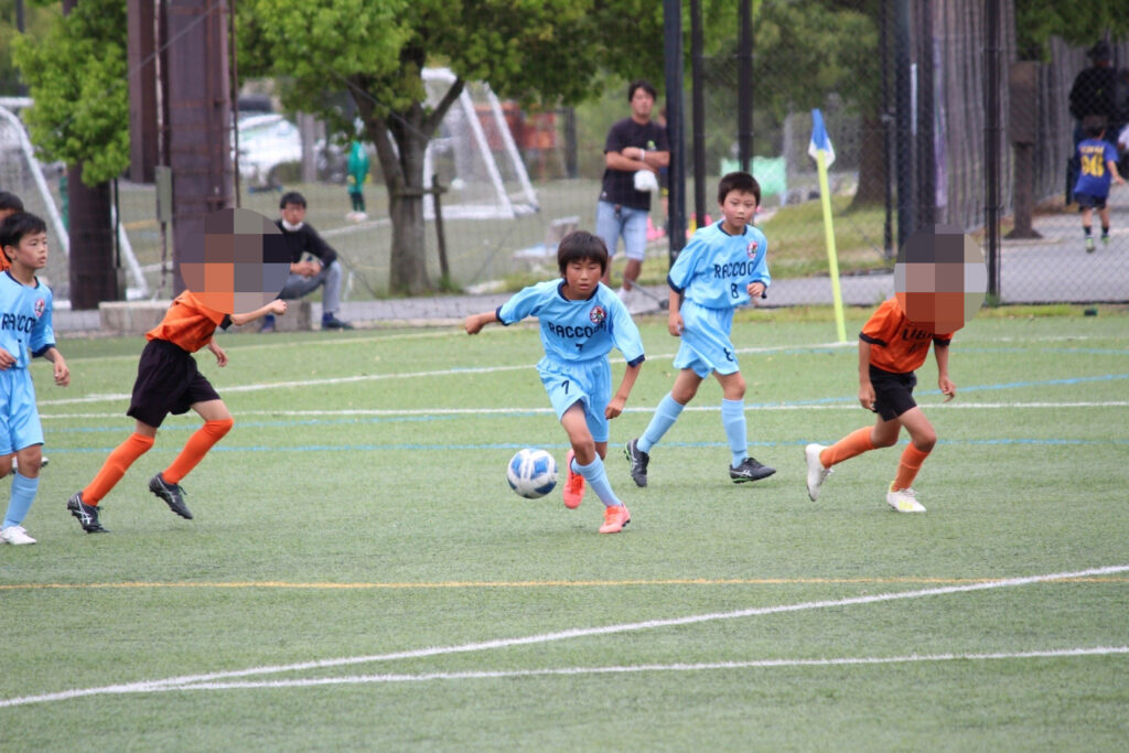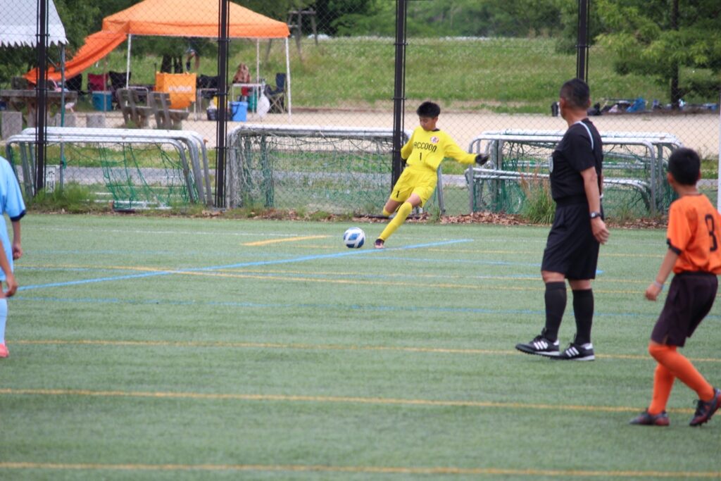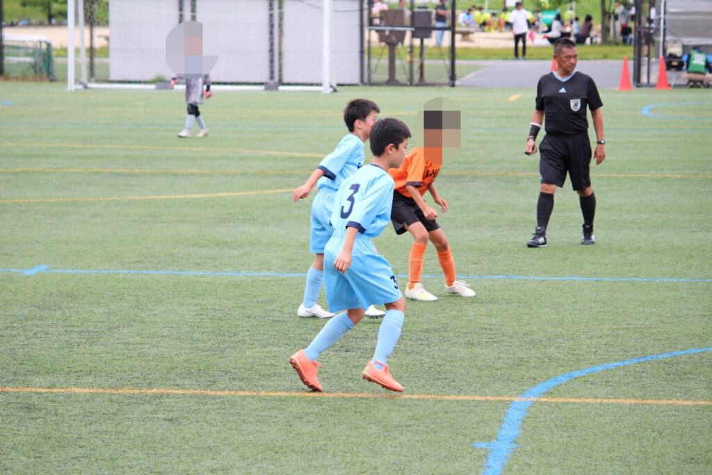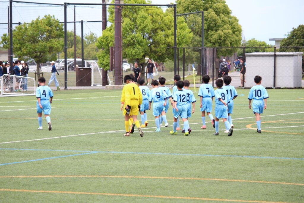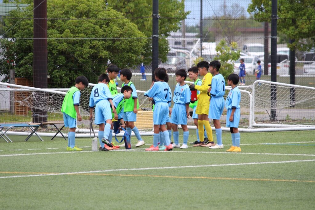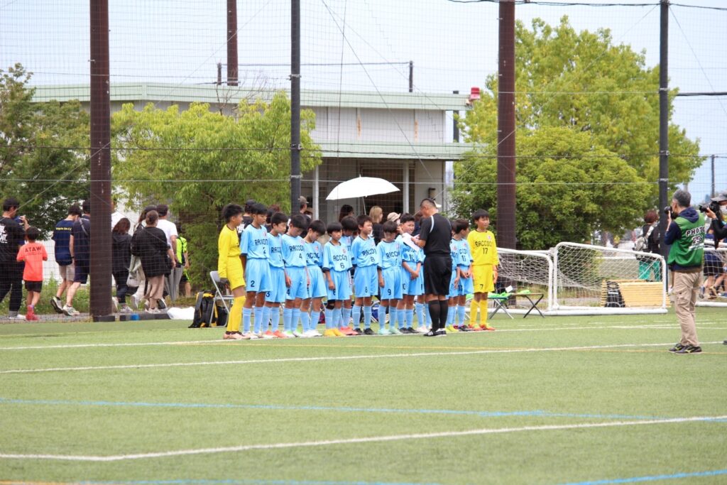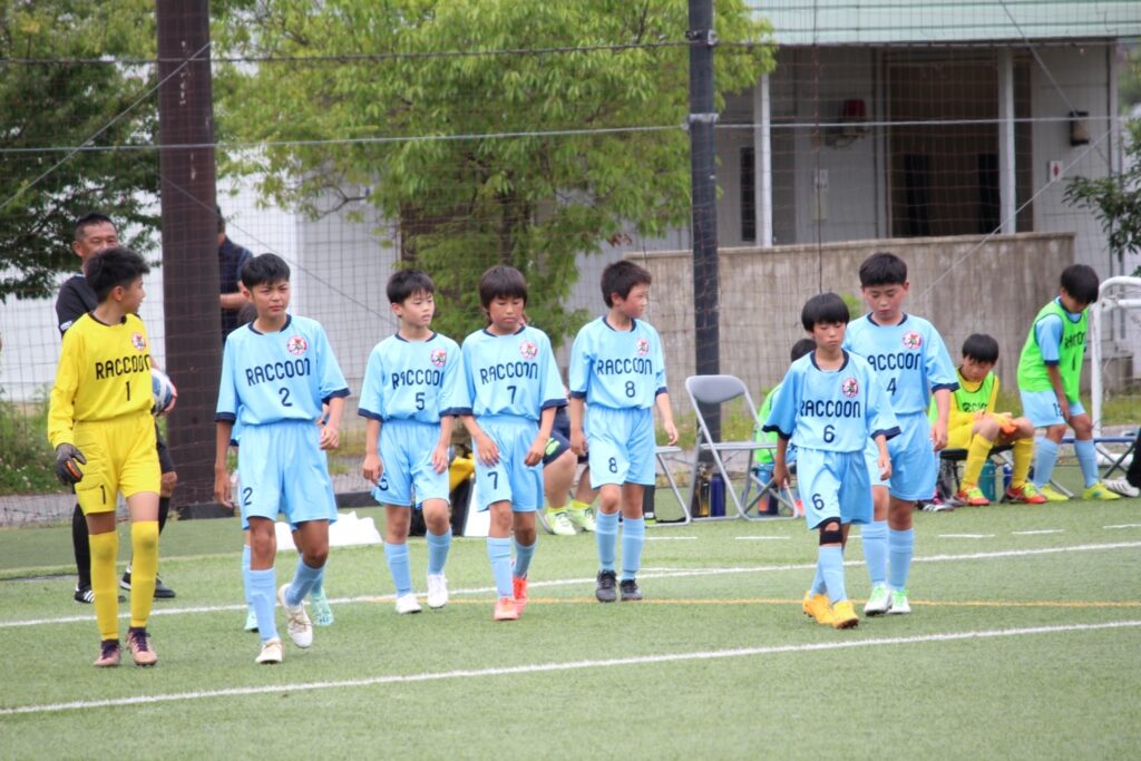 今年からコロナ禍も終わったので、選手同士の挨拶、円陣、と全てが解禁になりました。ラクーンFCが甲賀ブロックに加入させてもらってすぐにコロナが始まりました。当時この子たちは小学校2年生の冬からコロナと付き合い始め、3年生、4年生、5年生と本来みる光景(選手同士の挨拶、握手、円陣)が見れなかったのです。なので試合前から色々な行動に驚き、おどおどしながら審判の指示に従い行っていました。コーチもそこを子どもたちに教えていなかったことが汚点でした😫