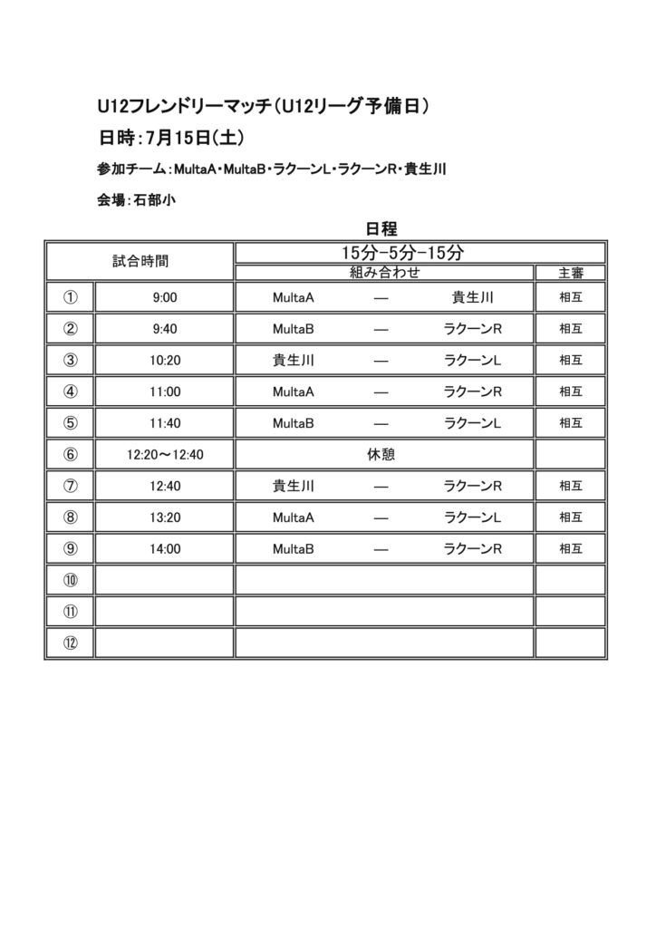 さて、U-12トレーニングマッチの詳細を下記の通りお知らせいたします。