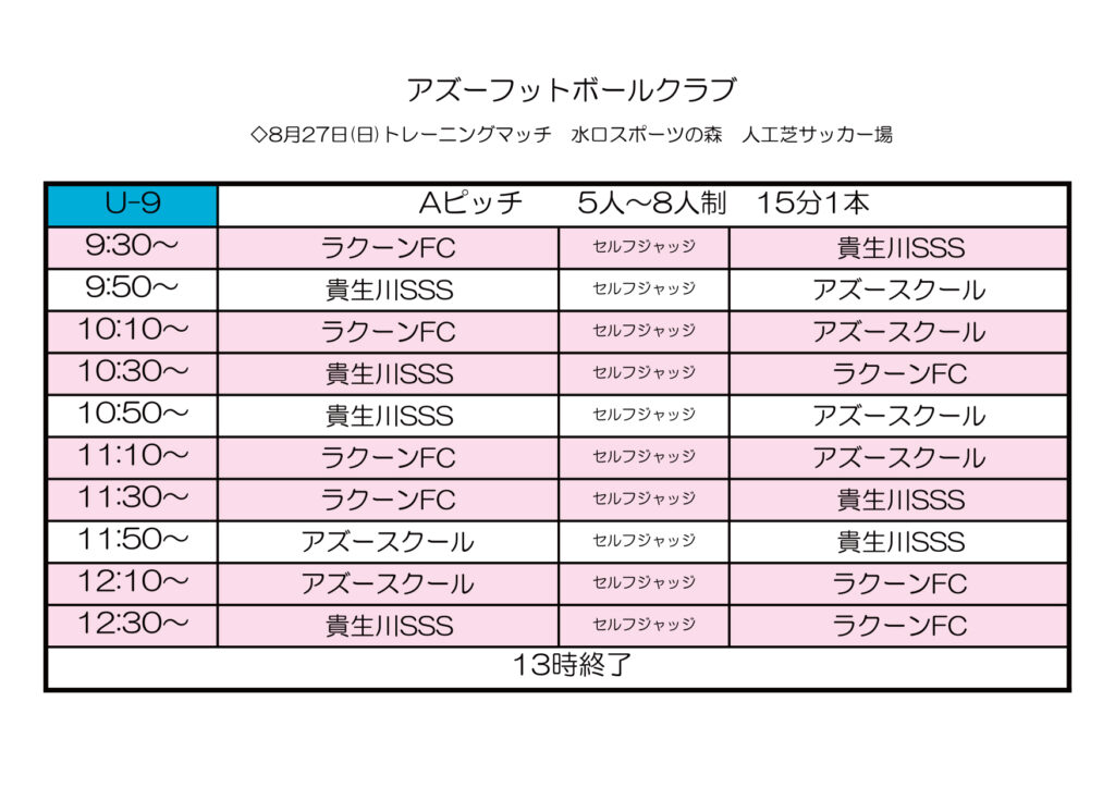 さて、U-9AZULトレーニングマッチの詳細を下記の通りお知らせいたします。