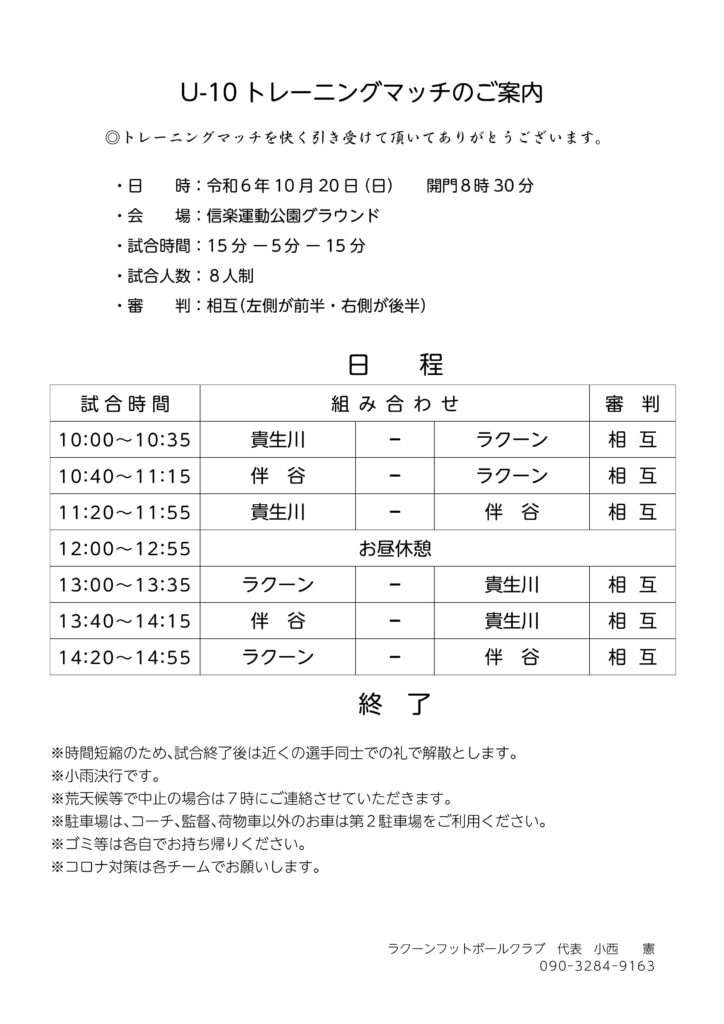 さて、U-10トレーニングマッチの詳細を下記の通りお知らせいたします。