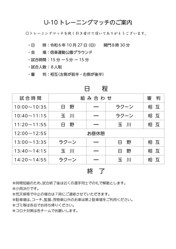 さて、U-10トレーニングマッチの詳細を下記の通りお知らせいたします。