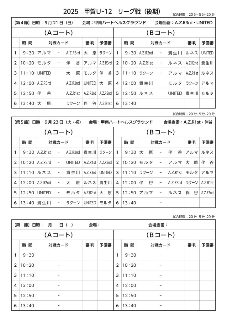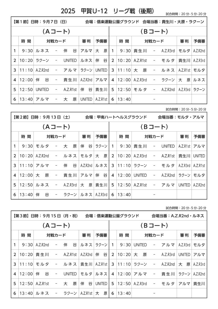 さて、U-12リーグ戦 後期の詳細を下記の通りお知らせいたします。